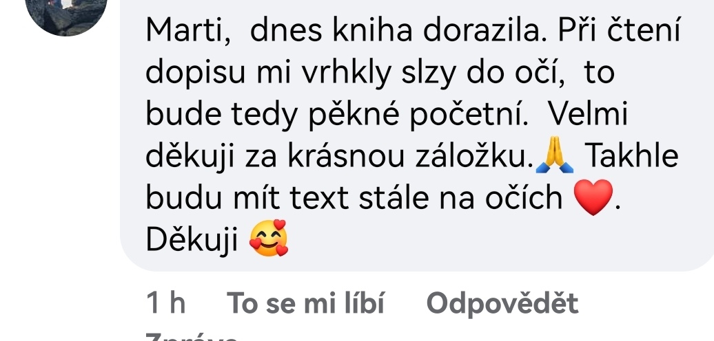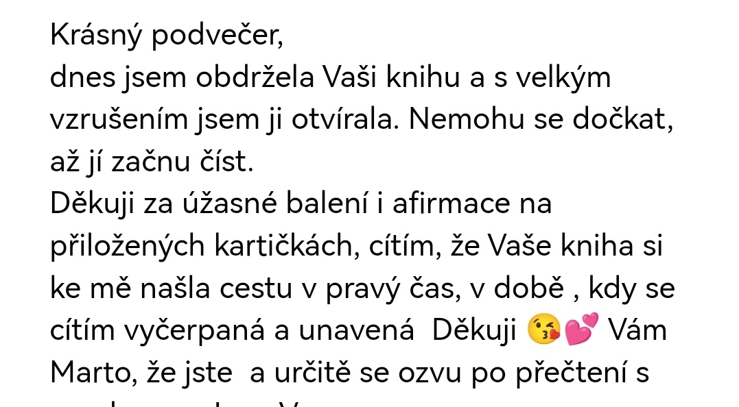 Za soumraku jsem si sedla s tvou knihou a nemohla jsem se odtrhnout. Četla jsem ji skoro bez dechu. Neuvěřitelně to mnou rezonuje. A hned ji objednávám i pro své děti a snachy. Je důležité, aby si ji přečetli, ale tu moji vlastně nechci nikomu půjčovat.